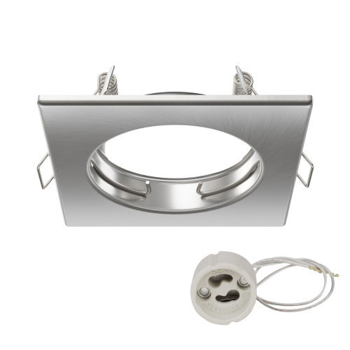 Aro empotrable basculante cuadrado cromado con unas medidas de 78x78x58 milímetros, diseñado para la instalación de una bombilla LED dicroica GU10. Medida de corte: Ø42 milímetros.