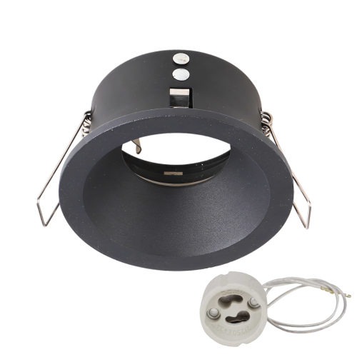 Aro empotrable fijo en color blanco con unas medidas de Ø85×45 milímetros, diseñado para la instalación de una bombilla LED dicroica GU10. Incluye portalámparas. Medida de corte: Ø76 milímetros.
