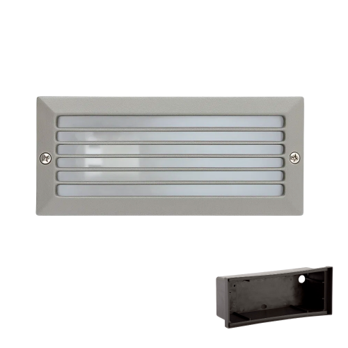 Bañador de empotrar para pared fabricado en aluminio lacado en blanco, negro o gris y cristal con portalámparas E27. Cuenta con unas medidas de 100x232x82 mm y un índice de protección IP54. Incluye caja de empotrar en obra. Incluye caja de empotrar.