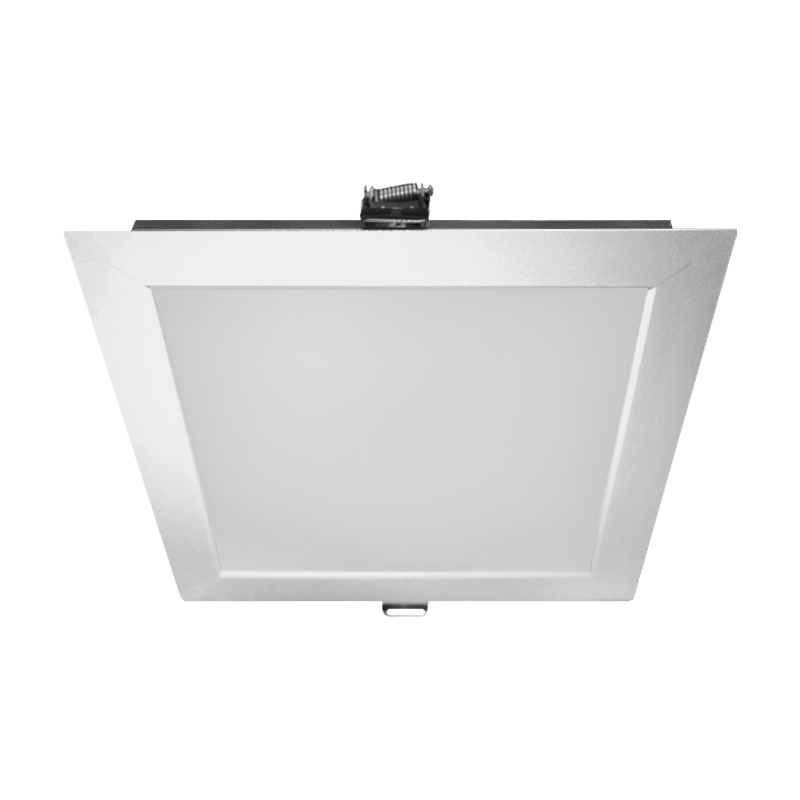 Downlight cuadrado de aluminio lacado en blanco o plata con placa LED Epistar SMD 2835, unas medidas exteriores de 205x205mm, un ángulo de apertura de 120º.