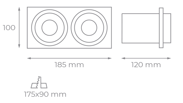 Empotrable doble de aluminio lacado en blanco o negro con unas medidas de 185x100x120mm y un corte de 175x90mm que se convierte en proyector 360º.